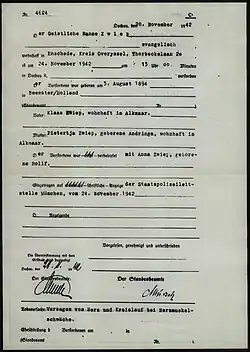 The Reverend Nanne Zwiep (3 August 1894 in Beemster, North Holland – 24 November 1942 in Dachau) was a pastor of the Dutch Reformed Church in the town of Enschede. He was arrested by the Nazis during the German occupation of the Netherlands and murdered in the concentration camp at Dachau near Munich.