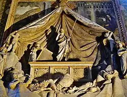 A number of the largest commissions in Venetian-controlled cities with which he was probably involved are wall tombs with large frames, some including significant paintings in the whole ensemble. The most striking of these is the Brenzoni Monument in the church of San Fermo Maggiore, Verona, which includes a Resurrection group of Christ, four sleeping soldiers, three angels, and two putti who hold back large canopy curtains in marble, a Venetian style in wall tombs, that here gives the scene something of the effect of a tableau vivant.[16] Above this a fresco Annunciation is the earliest major work by the painter Pisanello to survive.[17] The whole is topped by a statue of a prophet. The monument was probably begun in the 1420s, with the frescos done by 1426, but only finished in 1439.[18]