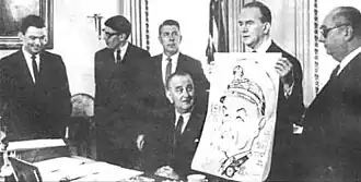 During the 1960s, cartoonists of military comic strips went to the White House and met with Lyndon B. Johnson in the Oval Office. The group included Caniff, Bill Mauldin and Mort Walker.