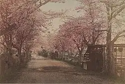 The first 12 cultivars presented were 'Yoshino', 'Kwanzan', 'Ichiyo', 'Taki-nioi', 'Shirayuki', 'Fugenzo', 'Ariake', 'Jo-nioi', 'Fukurokuju', 'Surugadai-nioi', 'Gyoiko', and 'Mikuruma-gaeshi'. With the exception of 'Yoshino', these 11 cultivars belong to the Sato-zakura group, a complex interspecific hybrid derived from the Oshima cherry. Many cultivars other than 'Yoshino' and 'Kwanzan' are not currently available for viewing because the government didn't obtained them after the original trees reached their maximum age.[29]