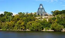 The three-tiered glass cupola is formed out of rectangular glass and narrow steel supports.[26] The second tier of the cupola is formed out of rectangles and equilateral triangles that are further subdivided into eight or twelve smaller equilateral triangles.[27] All these glass pieces are joined by steel struts. The third tier of the cupola is formed with similar designs, although the triangular glass panes are isosceles triangles.[27] The isosceles triangles converge upwards, with its apexes towards the centre.[27] The building's three-tiered cupola is positioned in a manner in which the cupola would be flanked by the Peace Tower and the Library of Parliament to the west when approaching the museum from the east.[28]