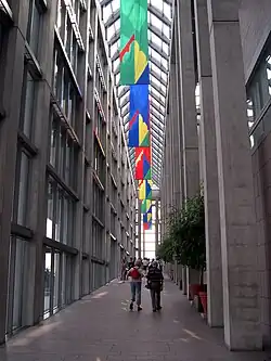 The interior entrance lobby is floored with pink-granite, and includes a straight four metres (13 ft) wide ramp which slopes upward towards the west.[29] Safdie noted the importance of the ramp in his design, stating that one should "go through some kind of procession to make your way into something as important as the National Gallery," and that it gave the visitor the feeling of making an ascent to a ritual, a ceremony.[30] The walls of the entrance lobby are lined with rectangular cut pink granite, excluding the southern wall, which is part of the glass-walled exterior facade.[31] A glass and steel ceiling reminiscent of Gothic cathedral architecture, extends the entire way of the ramp.[31] However, as opposed to most Gothic cathedrals, the ceiling has several concrete columns spaced out to support the roof.[31] The summit of the ramp leads towards the Great Hall of the building, situated in the three-storey glass cupola.[26]