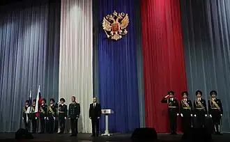 On 16 January 2017, President Vladimir Putin issued a decree establishing 27 March as the Day of the National Guard.[1] From 1996 to 2016, this day was celebrated as the Day of Internal Troops of Russia. The Day of Internal Troops was established by President Boris Yeltsin on 19 March 1996. The celebration of the Day of Internal Troops is historically liked to several decrees of Tsar Alexander I on the reorganization of the garrison units of the army and the creation of the Internal Guard. One of the final decrees, dated 27 March (8 April in the Gregorian calendar), 1811, marked the organization of the first Internal Guard.[2][3][4]