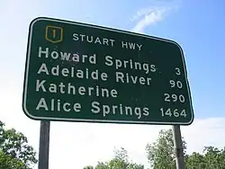 National Highway Sign located on the Stuart Highway near Darwin, listing distances to key locations on this highway.
