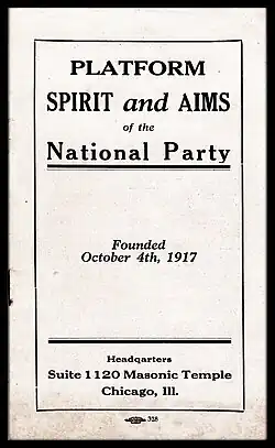 3. ^ Platform, Spirit and Aims of the National Party: Founded October 4th, 1917. Chicago: The National Party, 1917; pp. 11–12.
