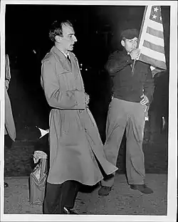 On May 25, 1963, an NRP rally on First Avenue between 85th Street and 86th Street was attended by approximately 2500 hecklers who threw "eggs and oranges" at the participants while Jack Weiser, commander of the Jewish War Veterans of New York State, attempted to make a citizen's arrest of James H. Madole for "inciting to riot against the Jewish people."[9] At least one member, Louis Mostaccio, was arrested for assault on an NYPD detective as a result of this incident.[18] Mostaccio, who attacked the detective with a flagpole, was convicted in June 1963 of assault but acquitted of the additional charge of "violating the weapons law by being in possession of the flagpole."[18] Mostaccio ended up serving five days for his crime.[19]