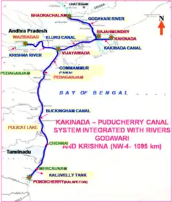 National Waterway 4 (NW-4) is a 1,095 kilometres (680 mi) long waterway in India. It has been declared as an Indian National Waterway and is currently under development. It connects the Indian states of Telangana,[1][2] Andhra Pradesh, Tamil Nadu, and the union territory of Puducherry. The NW-4 runs along the Coromandal Coast through Kakinada, Eluru, Commanur, Buckingham Canals and also through part of Krishna and Godavari rivers in South India. It was declared a National Waterway on 24 November 2008 under the Provisions of National Waterways Bill, 2006.[3] It is being developed by the Inland Waterways Authority of India (IWAI),[4] and was scheduled for completion by 2013. The National Waterways Act, 2016 has extended the length of NW-4 from 1,095 km (680 mi) to 2,890 km (1,800 mi) by connecting the Krishna and Godavari Rivers.[5] The Project would be undertaken in 3 phases with first phase beginning in October, 2017 and to be completed by June, 2019[6]