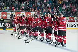 The Toronto Blue Jays, a franchise in Major League Baseball, honour Canada Day by wearing an alternate jersey instead of the team's usual uniform.[16] In the 1990s, the team would wear red baseball caps,[17] or a red uniform.[18] In 2012, the team wore a red uniform with white lettering.[19]