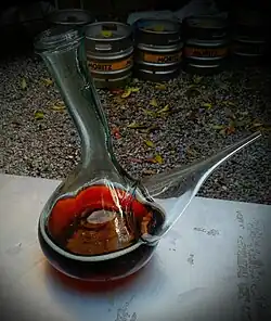 Porró is a traditional glass wine pitcher, originating in Catalonia. It allows everyone to drink from the same utensil without touching it with their lips. It fosters communal drinking accompanying food. Porrons are most commonly filled with wine.