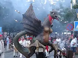 Víbria ("wyvern") is a mythical dragon with two legs, chiropteran wings, sometimes with marked feminine characters (like two prominent breasts) and bird-like, like an eagle's beak with claws and wings. The kings of the Crown of Aragon used it in their personal heraldry as crest. Today, it is frequently represented at traditional local Catalan festivals.