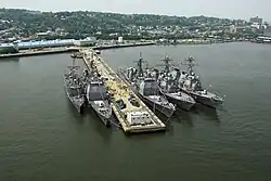 ![]() Guided-missile frigate USS Stephen W. Groves (FFG 29), guided-missile cruisers USS Hue City (CG 66) and USS San Jacinto (CG 56), and guided-missile destroyers USS Oscar Austin (DDG 79) and USS Winston S. Churchill (DDG 81) tied up at the home port pier during Fleet Week in 2007. | |