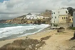 New houses began to be built outside of the fortified Old Town around the beginning of the 20th century. A new district, called Prosfygika (Greek: Προσφυγικά, meaning 'refugee district') was added in the 1920s after a wave of Greek refugees from western Turkey arrived on Naxos following the 1922 Asia Minor Disaster.[16] Development outside of the old city limits continued in the following decades due to people immigrating from the island's villages to the city, with a large wave of construction taking place in and after the 1970s with the rise of tourism.[17] The city's development was mainly concentrated in an area south of the old town, delimited to its west by Agios Georgios Beach, and to its east by the road connecting the city to the villages. The newly built areas include asphalt roads in grid configurations, which are used for car traffic. All new buildings have been built in a style resembling the traditional construction found in the Old Town and elsewhere on the island, according to local building regulations.