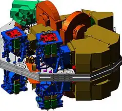 NIRCam (Near-InfraRed Camera) is an instrument aboard the James Webb Space Telescope. It has two major tasks, as an imager from 0.6 to 5 μm wavelength, and as a wavefront sensor to keep the 18-section mirrors functioning as one.[1][2] In other words, it is a camera and is also used to provide information to align the 18 segments of the primary mirror.[3] It is an infrared camera with ten mercury-cadmium-telluride (HgCdTe) detector arrays, and each array has an array of 2048×2048 pixels.[1][2] The camera has a field of view of 2.2×2.2 arcminutes with an angular resolution of 0.07 arcseconds at 2 μm.[1] NIRCam is also equipped with coronagraphs, which helps to collect data on exoplanets near stars. It helps with imaging anything next to a much brighter object, because the coronagraph blocks that light.[2]
