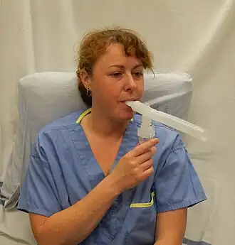 4. ^ a b Boe J, Dennis JH, O'Driscoll BR, et al. (July 2001). "European Respiratory Society Guidelines on the use of nebulizers". Eur. Respir. J. 18 (1): 228–42. doi:10.1183/09031936.01.00220001. PMID 11510796.