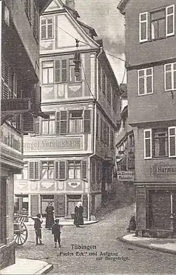 Birthplace of poet Ludwig Uhland. In 1830, the Hirschauer Tor was demolished. It was located between Neckar and Hohentübingen Castle. It was one of the five city gates in the old city wall of Tübingen and opened the way to Hirschau and Rottenburg. From the gate the single-storey remains of the round tower, a former prison, called Diebsturm, still exists.[12]