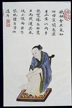 A 45-character inscription on a Warring States era jade artifact may possibly be an earlier record of breath meditation than the Neiye.[32] This rhymed passage entitled xingqi (行氣; "circulating the vital breath") was inscribed on a dodecagonal block of jade, with nine trisyllabic phrases describing the stages of breath cultivation. While the dating is uncertain, estimates range from earlier than 400 BCE (Joseph Needham), 380 BCE (Guo Moruo), to late 4th century BCE (Harper). In any case, some scholars claim that it contains the earliest Chinese epigraphical evidence on the practice of breath meditation.[33]