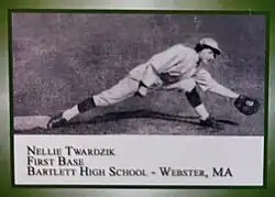Jennifer Ring notes in her book Stolen Bases: Why American Girls Don't Play Baseball[3] that during 1935, 15-year-old Nellie Twardzik gained national recognition when she beat out twenty-five boys to make the Bartlett baseball team. At the time, there were no written gender rules that applied to baseball. Although Nellie was first celebrated for winning a position on Webster's varsity team in 1935, she was blocked from trying out for the team in her second year because of her gender.