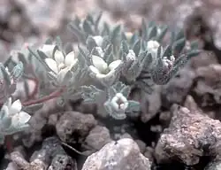 This is a small annual herb forming cushions of foliage at ground level, the stems no more than a centimeter long. The hairy, spoon-shaped leaves are 2 to 3 millimeters long. The inflorescence is a headlike cluster of flowers on hairlike pedicels. The flower has hairy sepals one millimeter long and a white corolla up to 3 millimeters long. The fruit is a tiny capsule with a rounded end and a pointed tip.[2]