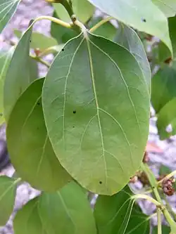 Leaves are pointed; ovate to elliptic in shape, 6 to 13 cm long, 2 to 6 cm wide. Glossy above and pale grey below. The leaf stem is green, between 12 and 20 mm long. Leaf veins are prominent, with three to five lateral veins. The basal pair of veins starts around 5 mm from the leaf base. And travels for about half the leaf length in a curve. Twigs are smooth, either brown or green.