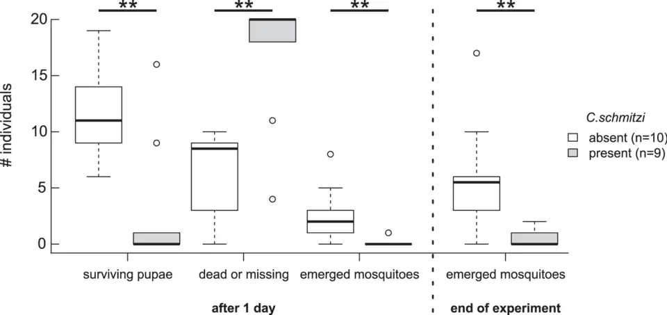 Right: Effect of C. schmitzi presence on survival of infaunal mosquito pupae and successful emergence of mosquitoes (Aedes sp.) from N. bicalcarata pitchers. The experiment began with 20 living pupae occupying each pitcher.[44]