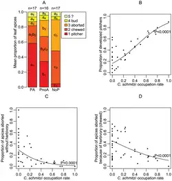 Left centre: Effect of C. schmitzi occupancy on leaf apex abortion and pitcher production rates. In the first chart (A), cases where the tendril was found to be cut are grouped under unknown fate (denoted with a question mark) and "pitcher" encompasses both living and dead traps (in non-pitchering plants, the latter).[5]