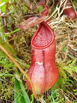 In open areas, N. bokorensis is sometimes sympatric with other carnivorous plants, including sundews and bladderworts.[11] The N. bokorensis plants found by François Mey in 2007 grew alongside a crimson form of Drosera peltata, but this population was destroyed by the time of the author's return in 2009.[12] Drosera peltata still grows sympatrically with N. bokorensis at "Location C", a massive clearing discovered in 2011 on the Bokor plateau.[11] The D. peltata plants at this site range in colour from yellowish-green to red and frequently exceed 30 cm in height.[11] Nepenthes bokorensis also shares this habitat with another sundew—D. burmanni—as well as with various grasses, stunded shrubs, and lithophytic orchids.[11] Local bladderwort species include U. bifida, U. odorata, U. minutissima, U. striatula, U. subulata, and U. uliginosa.[13][14][15][16]