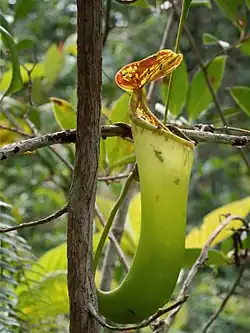 | An upper pitcher colonised by ants of the genus Crematogaster | |