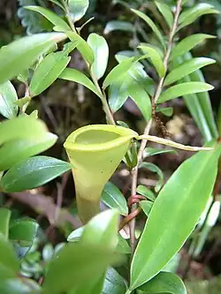 Nepenthes dubia /nɪˈpɛnθz ˈdbiə/ is a tropical pitcher plant endemic to the Indonesian island of Sumatra, where it grows at an altitude of 1,600–2,700 m above sea level.[6] The specific epithet dubia is the Latin word for "doubtful".
