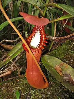 The pitcher base is bulbous to ovoid, with the pitcher cup becoming cylindrical in the upper two-thirds to three-quarters. The pitchers are some of the largest in the genus, sometimes exceeding 50 cm in height and 15 cm in width,[5] although they are usually around 30 cm high.[34] Wings at the front of the pitcher cup are either greatly reduced or absent altogether. On the inner surface of the pitcher, the glandular region is present in the bulbous portion. The mouth is elongated into a neck and has an oblique insertion. The peristome is cylindrical and up to 30 mm wide. It bears very highly developed teeth and ribs, the latter reaching 20 mm in diameter.[34] The pitcher lid or operculum is cordate, up to 8 cm wide,[27] and lacks appendages. An unbranched spur up to 20 mm long is inserted near the base of the lid.[5] Pitchers range in colour from light yellow to dark red.[34][35] The inner surface of the pitcher is usually white, contrasting sharply with the rich colouration of the outer surface. Most parts of the pitcher are very flexible, including the peristome ribs, with only the pitcher base, where the digestive zone is located, being rigid.[36][37]
