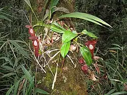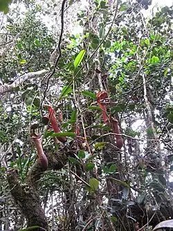 Contrary to the observations of Frederick William Burbidge,[43] N. edwardsiana grows not only as an epiphyte, but also occurs terrestrially on moss-covered rocks. It typically grows amongst ridge-top vegetation in dense mossy forest.[5] The natural habitat of N. edwardsiana is constantly moist[44] as the slopes are often enveloped in clouds.[5] Despite generally occurring epiphytically, N. edwardsiana seems to grow mostly in areas with ultramafic soils,[5] although it has also been recorded from sandstone substrates.[4]