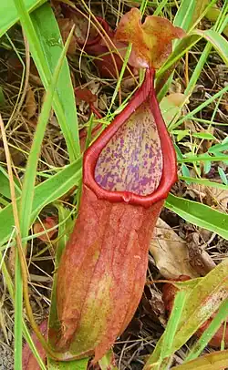 Rosette and lower pitchers are either wholly ovate or ovate in the basal half of the pitcher cup and narrower above. They measure up to 15 cm in height by 5 cm in width. The hip is usually located near the middle of the pitcher, but may be completely absent in entirely ovate traps. A pair of wings (≤12 mm wide) runs down the ventral surface of the pitcher cup, bearing narrow fringe elements. The pitcher mouth is smoothly triangular and has an oblique insertion. The peristome is flattened and up to 10 mm wide, with teeth up to 1 mm long. The extent of the glandular zone of the inner surface is variable, ranging from one-third to two-thirds of the pitcher's height. The pitcher lid or operculum is broadly to narrowly ovate. It has a slightly cordate base and is often irregularly wavy at the margins. It measures up to 4.5 cm in length by 3.5 cm in width, being as large as or smaller than the pitcher orifice. The lower surface of the lid does not have any appendages, but bears numerous crater-like glands (≤1 mm in diameter), the largest of which are located around the midline. A small depression is also present on the lower surface of the lid, near the apex. An unbranched spur (≤5 mm long) is inserted near the base of the lid. On their outer surface, terrestrial pitchers are typically green to orange with red stripes, or red throughout. Red blotches are present in the waxy zone of the inner surface. The colour of the peristome is highly variable and may be green to orange or red. The lid ranges in colour from orange to red, and bears fine red streaks.[2][4]