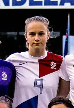 In France, like in 2015, the Netherlands met Canada and New Zealand in the group stage as well as Cameroon.[7] With three wins, the Netherlands qualified for the knockout stages. Again like in 2015, Japan was the opponent in the first knock-out round.[8] With two goals from Lieke Martens, the Netherlands reached the quarter-final against Italy. The Netherlands won 2–0, with Miedema scoring her third World Cup goal. With this, the Netherlands also qualified for the Olympic Games 2020 for the first time. In the semi-final, after 90 goalless minutes, Jackie Groenen scored the only goal of the match in extra time.[9] The Netherlands reached the final, where they lost to defending champions United States with 0–2.[10]