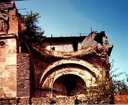The museum was closed at the beginning of World War II in 1939.[4] The destruction in the war followed these internal destructions of the original museum layout. In the bombardments on 23 November 1943, the central stairway and its frescos were burned, along with other great treasures of human history. In February 1945, Allied bombs destroyed the northwest wing as well as the connection to the Altes Museum and damaged the southwest wing as well as the south-east façade (risalit).