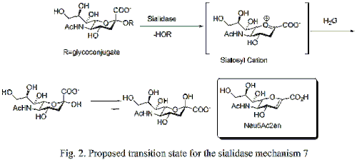 The unsaturated sialic acid (N-acetylneuraminic acid [Neu5ac]) derivative 2-deoxy-2, 3-didehydro-D-N-acetylneuraminic acid (Neu5Ac2en), a sialosyl cation transition-state (Figure 2) analogue, is believed the most potent inhibitor core template. Structurally modified Neu5Ac2en derivatives may give more effective inhibitors.[15]