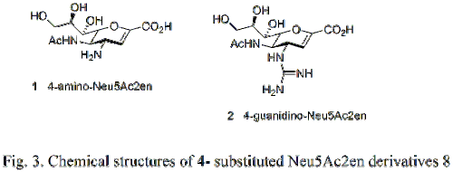Many Neu5Ac2en-based compounds have been synthesized and tested for their influenza virus sialidase inhibitory potential. For example: The 4-substituted Neu5Ac2en derivatives (Figure 3), 4-amino-Neu5Ac2en (Compound 1), which showed two orders of magnitude better inhibition of influenza virus sialidase than Neu5Ac2en5 and 4-guanidino-Neu5Ac2en (Compound 2), known as Zanamivir, which is now marketed for treatment of influenza virus as a drug, have been designed by von Itzstein and coworkers.[16] A series of amide-linked C9 modified Neu5Ac2en have been reported by Megesh and colleagues as NEU1 inhibitors.[17]