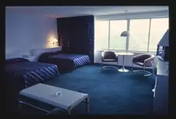 The Nevele Country Club was established in 1901 by Charles Slutsky (1861-1931), who named the first accommodation the Nevele Falls Farm House. Following the Catskill hotel fashion of Mission Revival architecture, new wings were built in that style in the 1920s and 1930s. The Slutsky family also operated the adjoining Fallsview hotel, which was merged with the Nevele for a time. In the 1950s and 1960s, the Nevele was greatly expanded in the modern style that had come to prevail in the Catskills by then. Architect Sydne Schleman designed the Vacationer Wing and the Waikiki Indoor Pool in 1954. These were followed by architect Herbert D. Phillips' Golden Gate and Empire wings from 1956, linked to adjoining buildings by tunnels. Phillips also designed new lobbies in a style that followed the influential hotel designs of his former employer, Morris Lapidus, who had worked at other Catskill resorts. By 1964, Phillips was a partner at the New York firm Viola, Bernard & Phillips, who designed the ten-story dodecagonal Nevele Tower. The nearly-circular building was intended to counter the excessive corridor lengths that plagued more traditional Catskill hotels.[9][10] President Lyndon B. Johnson stayed at the Nevele in 1966 to dedicate a new hospital in Ellenville.[11]