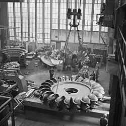 The reservoir provides water to power two hydroelectric plants, New Colgate Powerhouse and Fish Release Powerhouse. New Colgate Powerhouse is not located at the base of the dam, like most hydroelectric plants. Instead, the 14-foot (4.3 m) diameter New Colgate Tunnel carries the water about 5 miles (8 km) southwest of the dam to the powerhouse. This increases the head, which allows the plant to produce more electricity. The dam's Pelton wheels are the largest ever built and have a combined capacity of 315 MW. Some water is released at the base of the dam so that the streambed is not completely dewatered upstream of the New Colgate Powerhouse tailrace. This water powers the 150 kW Fish Release Powerhouse. In the event of a power outage, this plant can operate the dam's massive spillway gates.