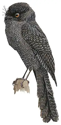 The New Caledonian owlet-nightjar (Aegotheles savesi), also known as the enigmatic owlet-nightjar, is a large owlet-nightjar with vermiculated grey-brown and black plumage. It has a long, slightly rounded tail, short, rounded wings, and long, stout legs. Its voice is unknown, but other owlet-nightjar species make churring and whistling sounds. It is the second-largest known owlet-nightjar (only the extinct New Zealand owlet-nightjar was larger), much larger than the Australian owlet-nightjar.