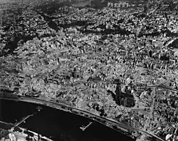 Due to the heavy bombing of Frankfurt am Main in World War II, most of the city's old town was destroyed. Efforts to rebuild parts of the historic fabric of the old town began in the 1950s with the Römer city hall, which was built as a modern office building behind the old façade that was still standing after the war. An underground car park was built under the Römerberg square, and on top of the Romerberg area, in front of the cathedral, the brutalist Technisches Rathaus[1] ("Technical City Hall") was built in 1974. The Technisches Rathaus was demolished in 2010–11, and the reconstruction of the old town core began. The project was built on top of a 1970s underground multi-storey car park and the U-Bahn Line B station.