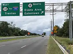 Route 138 is a state highway located entirely in Monmouth County, New Jersey that extends for 3.52 miles (5.66 km). The route's western terminus is at the eastern end of Interstate 195 at the interchange with Route 34 in Wall Township. Route 138's eastern terminus is at Route 35 in Wall Township. The highway is also meant to be an evacuation route in case of a disaster, where the eastbound lanes (as well as the eastbound lanes on Interstate 195) would be reversed all the way to the New Jersey Turnpike.[2]