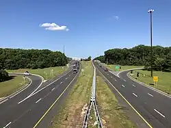 The current alignment of Route 138 originates as an alignment of the State Highway Route 38 assigned in 1938. At that point, Route 38 was proposed as a highway from Camden (where it would end), past its former terminus at State Highway Route 39 to an intersection with State Highway Route 4-N in the community of Wall Township east of Fort Dix.[4] A short portion of the highway was constructed from State Highway Route 34 to State Highway Route 35 was constructed as Route 38, which survived the 1953 state highway renumbering.[5] During the 1960s, the New Jersey State Highway Department began to lay out a network of limited-access state highways across the state. The Route 38 freeway was proposed as a highway from Interstate 676 in Camden to current-day Route 18 in Wall Township, to relieve congestion off of Route 70.[6] The freeway was readopted by the Delaware Valley Regional Planning Commission for the new Route 38 freeway from the Ben Franklin Bridge eastward (paralleling Route 70 and U.S. Route 30) to the area of Jackson Township, where it would follow current Interstate 195's alignment.[7] The 33.5-mile-long (53.9 km) freeway was estimated by the highway department to cost $60 million (equivalent to $514.5 million in 2024)[8] and to be finished around 1985.[7] The proposal lasted through the 1970s, along with a cost adjustment in 1972, inflating the amount to construct the freeway at $101 million (equivalent to $759.2 million in 2024).[9] By the end of the 1970s, the Route 38 freeway was facing opposition and limited resources, so the project was shelved. On July 29, 1988, the portion of Route 38 from Route 34 to Route 35 was re-designated to Route 138.[10]