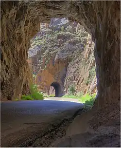 The road through the Rio Guadalupe box canyon bears the designation Forest Road 376 in Santa Fe National Forest near the unincorporated town of Cañones (or Gilman). The continuation as Forest Road 376 eventually terminates at New Mexico State Road 126 east of San Pedro Parks Wilderness. The route incorporates the Gilman Tunnels (1 mi (1.6 km) beyond the transition to Forest Road 376) which was part of the former Santa Fe Northwestern Railway (SFNW) through the canyon which was used to haul lumber from the Jemez Mountains. The railway opened in 1924 but never recovered financially from the Wall Street crash of 1929,[3] and ceased operations in May 1941 following flood damage from the Rio Guadalupe.[4]