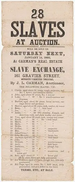 By the 1850s the city had what was essentially a dedicated "slave district" that was "dominated by traders' pens and offices: in 1854, there were no fewer than seven slave dealers in a single block on Gravier, while on a single square on Moreau Street there was a row of eleven particularly commodious slave pens."[6] A lady of New Orleans wrote that her doubts about the colonization scheme were fueled by the profitability of the slave supply chain that stretched across the South: "But alas! while we can see from one of our broadest! streets suspended from the tops of the houses across the street a pennon bearing in large letters this inscription—Talbot's Slave Depot—with the lower floor filled with men and women for sale— specimens of them at the doors— and the very high prices which these victims now command — we fear that Virginia and the other exporting States will send down more slaves for Talbot than free men for Liberia."[7]