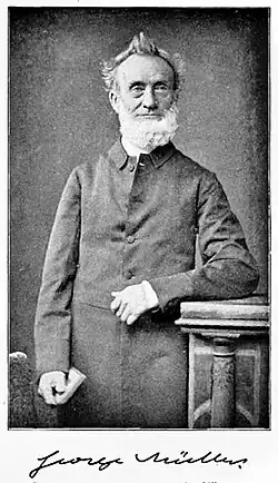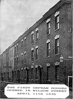 On 20 November 1835, Müller had it in mind to open an orphan house in Bristol to prove that God not only existed but that He heard and answered prayer, and Müller set about doing so on 21 November. He prayed that he might be given £40 as an encouragement but by 23 November he received gifts of around £50 from unexpected sources. His reasons for establishing this work were "1. That God may be glorified, should He be pleased to furnish me with the means, in its being seen that it is not a vain thing to trust in Him; and that thus the faith of His children may be strengthened. 2. The spiritual welfare of fatherless and motherless children. 3. Their temporal welfare."[4] He took inspiration from the large orphanage established in the 18th century by AH Francke at Halle, Germany.[5] A public meeting was held at which Müller announced his intentions but that he would be making no appeal to any man for funding. It was his intention to receive only children who had lost both parents through death, to train girls for domestic service and boys for a trade.[6] He prayed for £1,000 and staff to run the home, together with premises from which to operate. Although the £1,000 had yet to be received, 6 Wilson Street was fitted up for the orphans, Mr and Mrs Müller moving to 14 Wilson Street, and, on 11 April 1836, the first girls moved in. By 21 April, 26 children had taken up residence.[7]