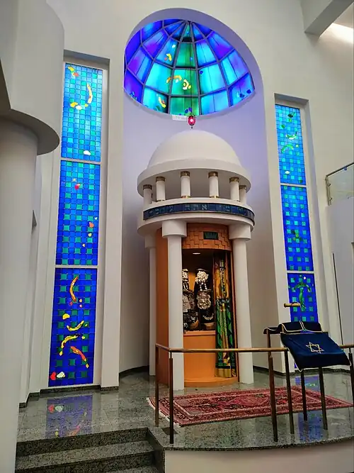 ![]() The Torah ark, stained glass windows and synagogue dome | |