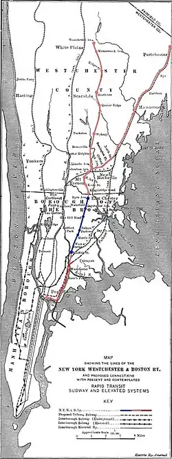 1. ^ Both Bang (2004) and Arcara (1983) report the entity incorporated on March 20, 1872 as the "New York, Westchester & Boston Railroad Company". Electric Railway Journal. Vol. XXXIX, No. 20, May 25, 1912 "The New York, Westchester & Boston Railway" (facsimile in Arcara (1964) and Arcara (1985)) refers the entity incorporated on that date as the "New York, Westchester & Boston Railway Company". S&P and Moody's refer to it as the Railway.