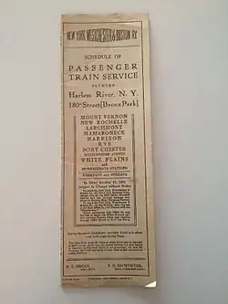 The New York, Westchester and Boston Railway Company (NYW&B, also known to its riders as "the Westchester" and colloquially as the "Boston-Westchester"), was an electric commuter railroad in the Bronx and Westchester County, New York from 1912 to 1937. It ran from the southernmost part of the South Bronx, near the Harlem River, to Mount Vernon with branches north to White Plains and east to Port Chester. From 1906, construction and operation was under the control of the New York, New Haven & Hartford Railroad (NH) until its bankruptcy in 1935.