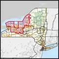 The current district includes all or parts of Cayuga, Wayne, Oswego, Ontario, Jefferson, Livingston, Niagara, Genesee, Wyoming, Seneca, Yates, Schuyler, and Orleans counties. With a Cook Partisan Voting Index rating of R+11, it is the most Republican district in New York.[3]