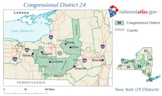 New York's 24th congressional district is located in Upstate New York in the Finger Lakes region, stretching alongside Lake Ontario from near Buffalo in the west to Watertown in the east. The district does not include Rochester, which is in the 25th district. Since 2023, it has been represented by Claudia Tenney. In the 2022 election it voted more strongly Republican than any other district in the state. Prior to the redistricting which took effect in 2023, the district included the city of Syracuse.