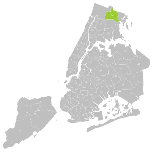 District 12 covers the farthest northeastern neighborhoods of the Bronx, including all of Williamsbridge, Baychester, Co-op City, and Eastchester as well as part of Wakefield.[4]